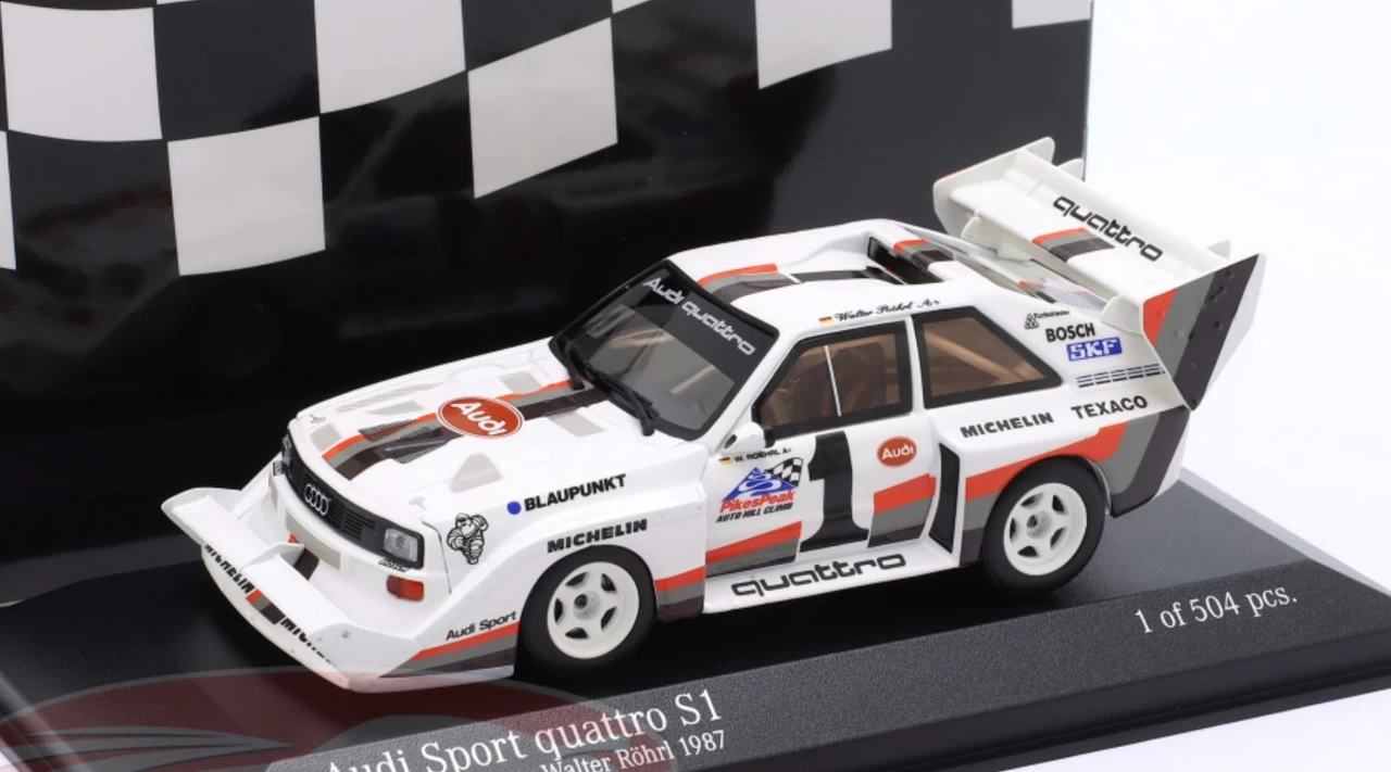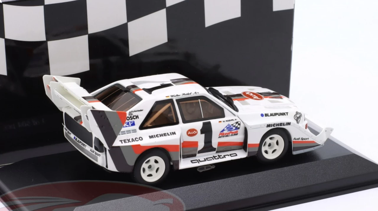 1/43 Minichamps 1987 Audi Sport Quattro S1 E2 #1 Winner Pikes Peak Audi Sport Team Walter Röhrl Car Model