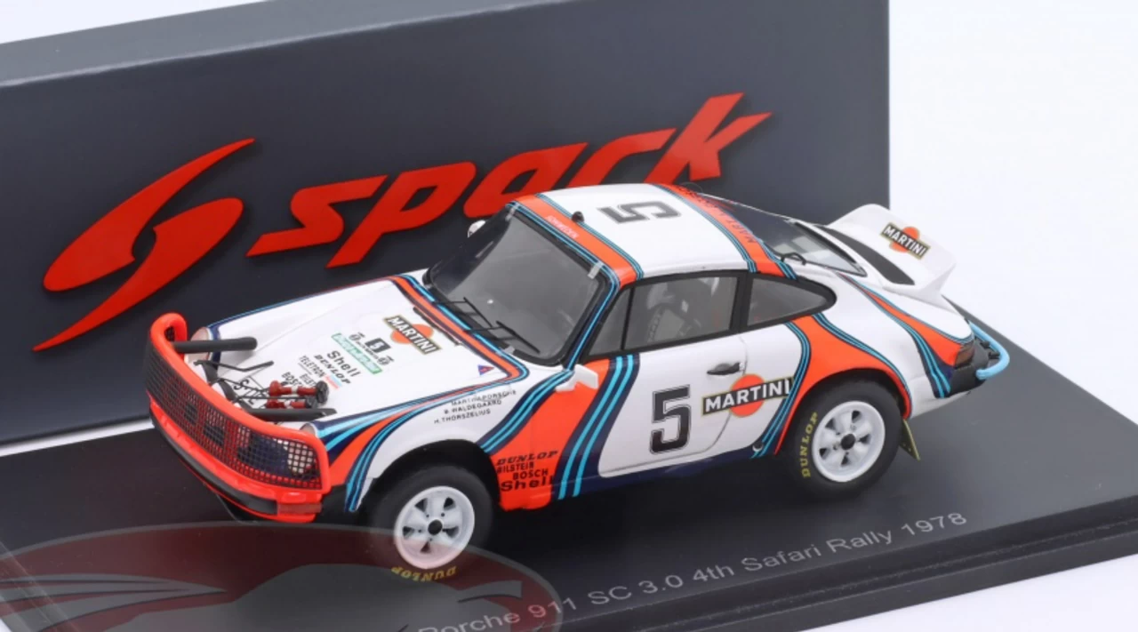 1/43 Spark 1978 Porsche 911 SC 3.0 #5 4th Safari Rallye Martini Racing Björn Waldegård, Hans Thorszelius Car Model