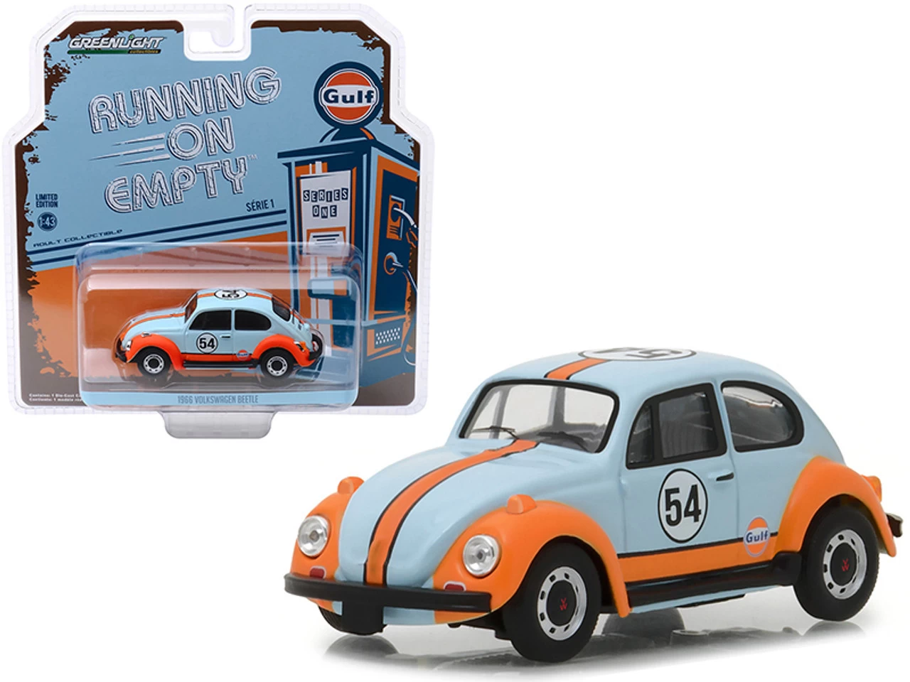 - Brand new 1/43 scale diecast car model of 1966 Volkswagen Beetle #54 “Gulf Oil” Light Blue and Orange “Running on Empty” Release 1 die cast model car by Greenlight.