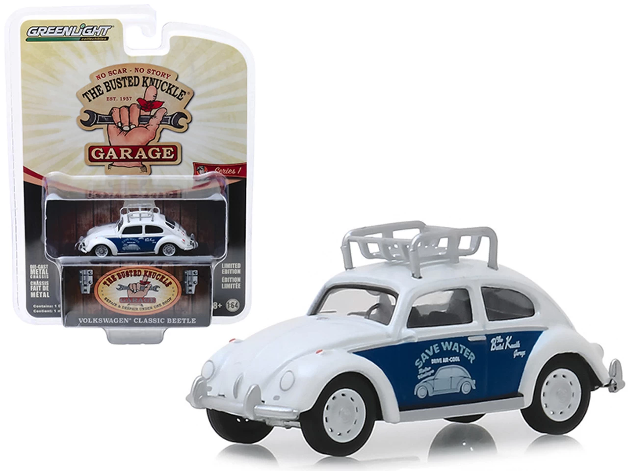 - Brand new 1/64 scale diecast car model of Classic Volkswagen Beetle with Roof Rack White “Save Water” “Busted Knuckle Garage” Series 1 die cast model car by Greenlight.