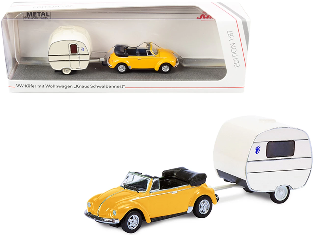 - Brand new 1/87 (HO) scale diecast car model of Volkswagen Kafer Convertible Yellow with Knaus Schwalbennest Travel Trailer Cream die cast model car by Schuco.